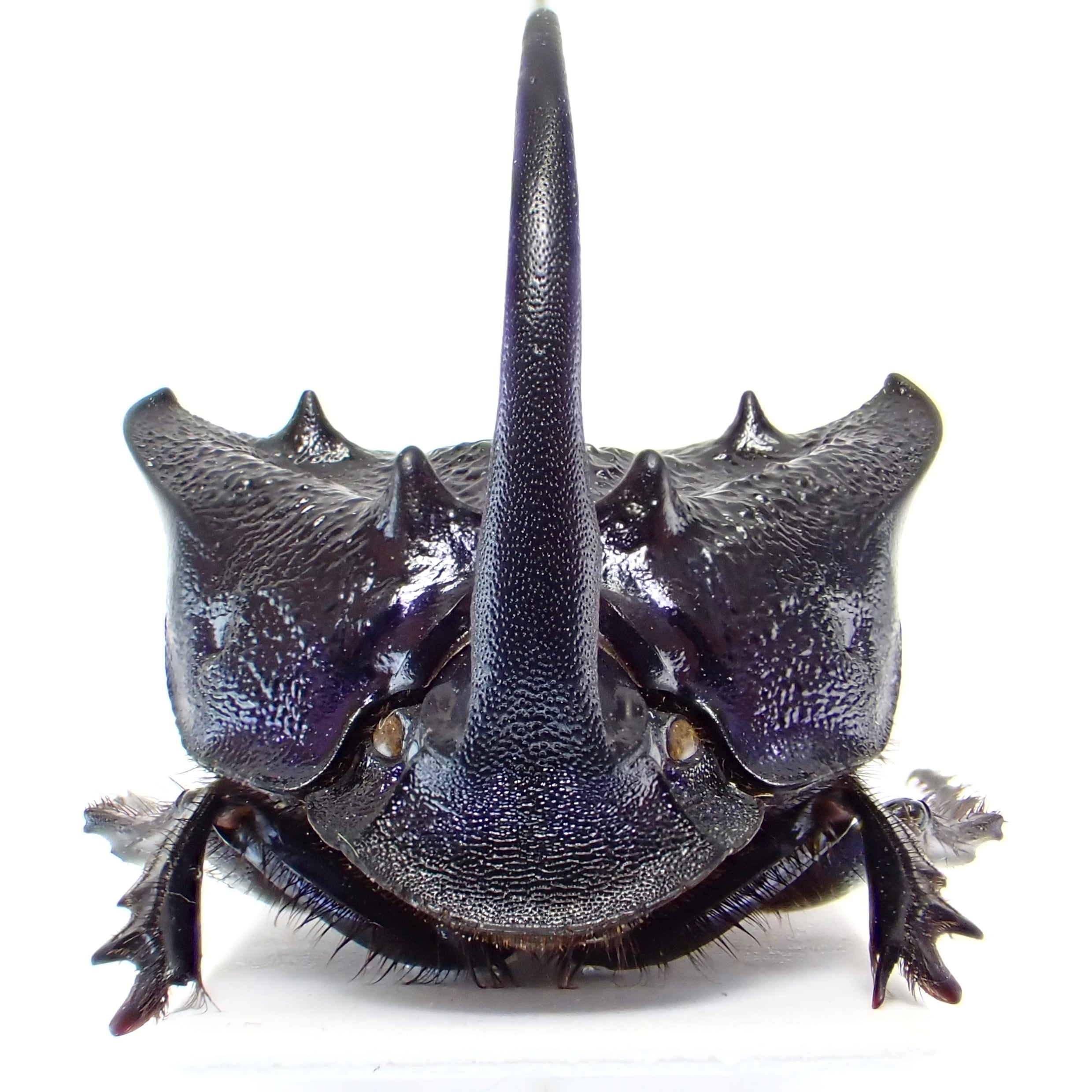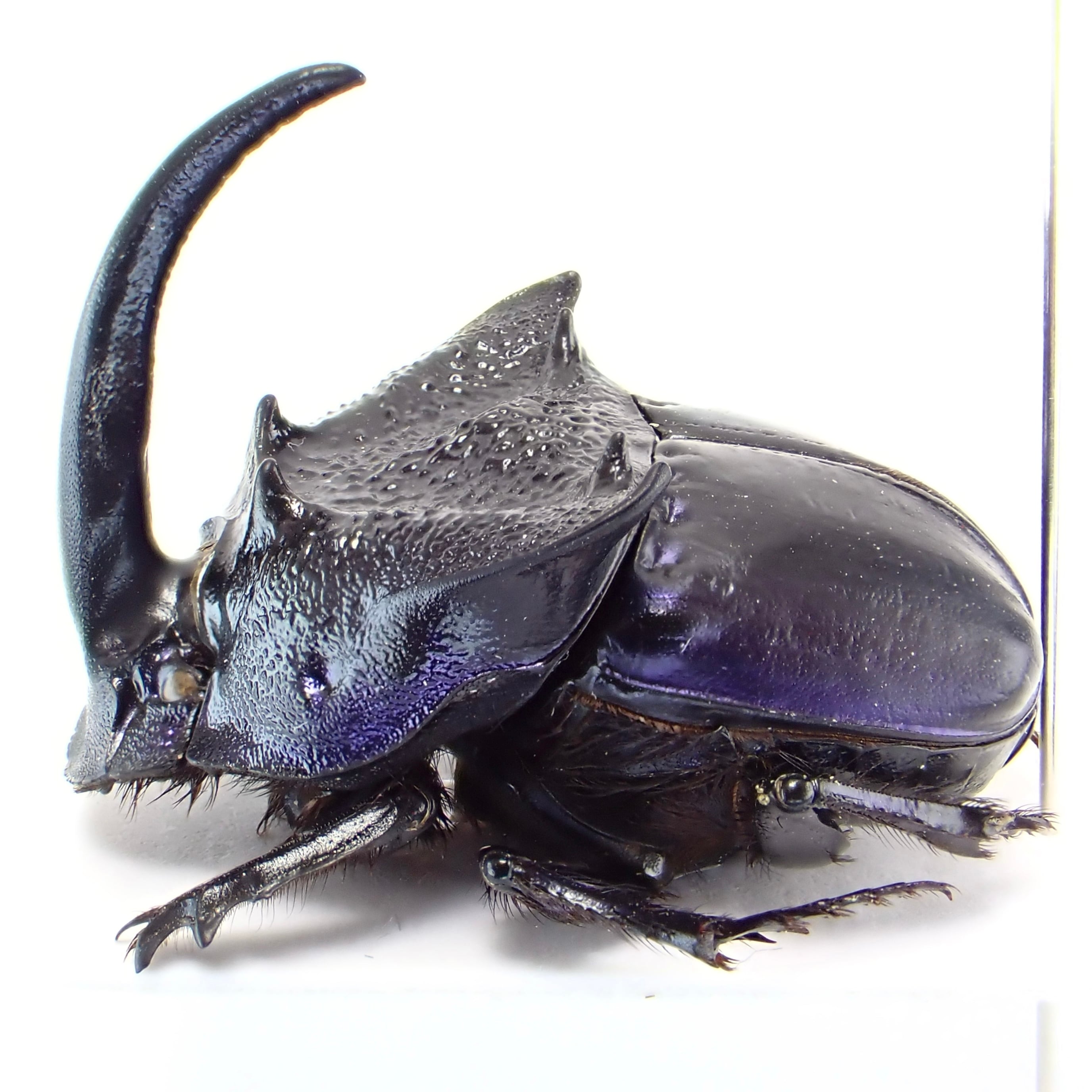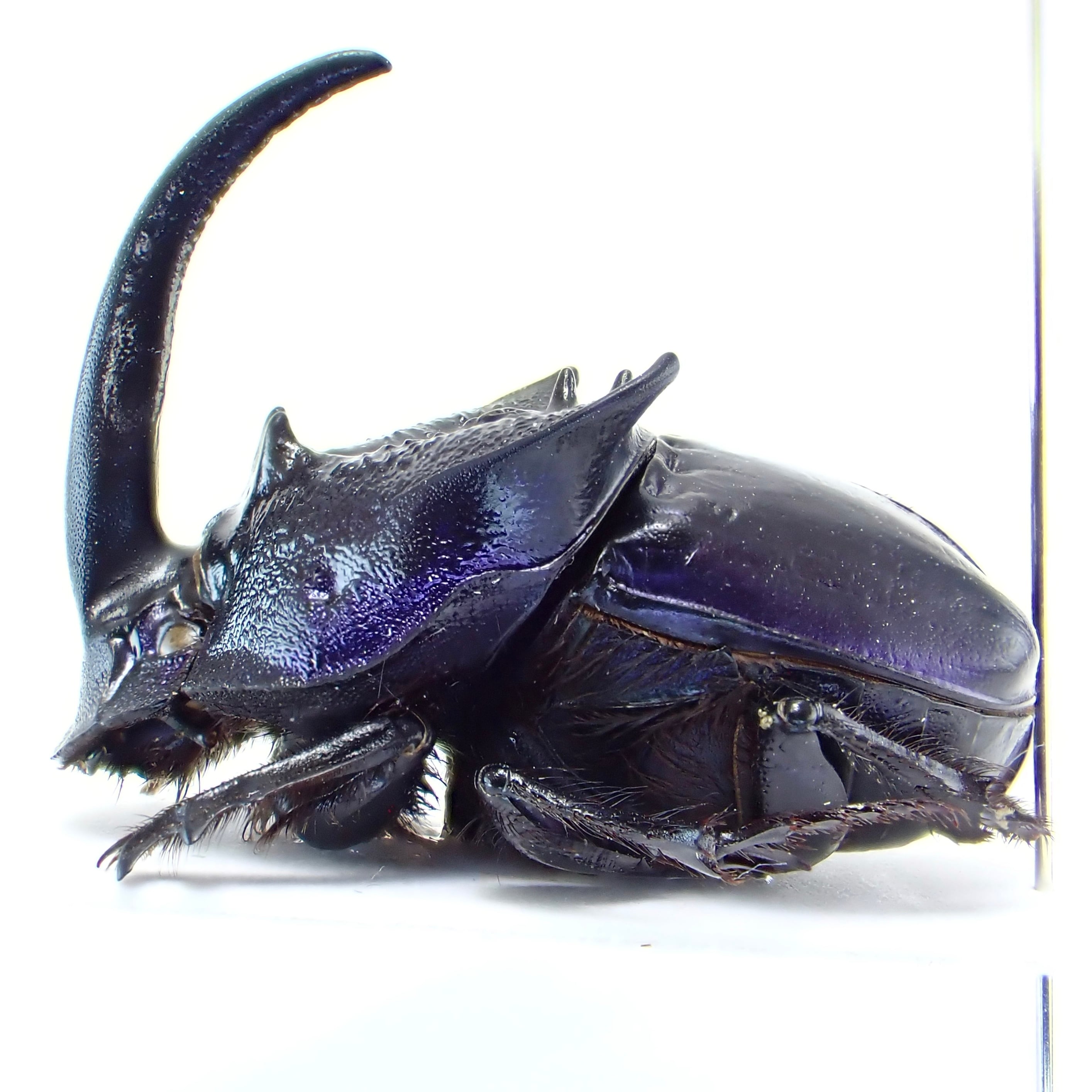 種名 : Phanaeus quadridens 産地 : メキシコ 性別 : オス サイズ : 21mm 商品:♂1匹。写真の標本をお送りします。 解説:菫色のニジダイコク。名前の通り胸部の突起が4本はっきり見える大型個体 状態:左後脚フ節先端欠け ※細かい欠けやサイズのズレはご了承ください。