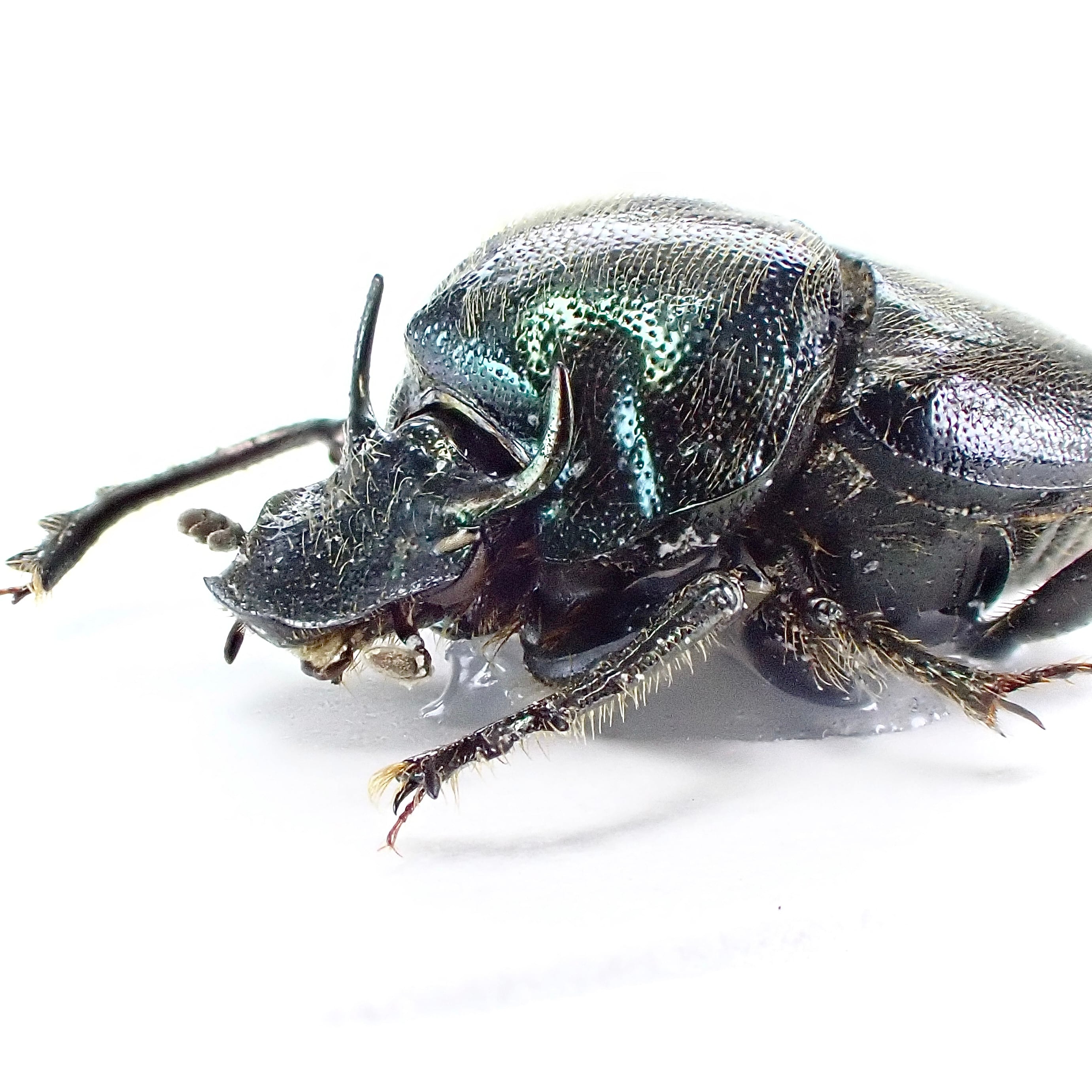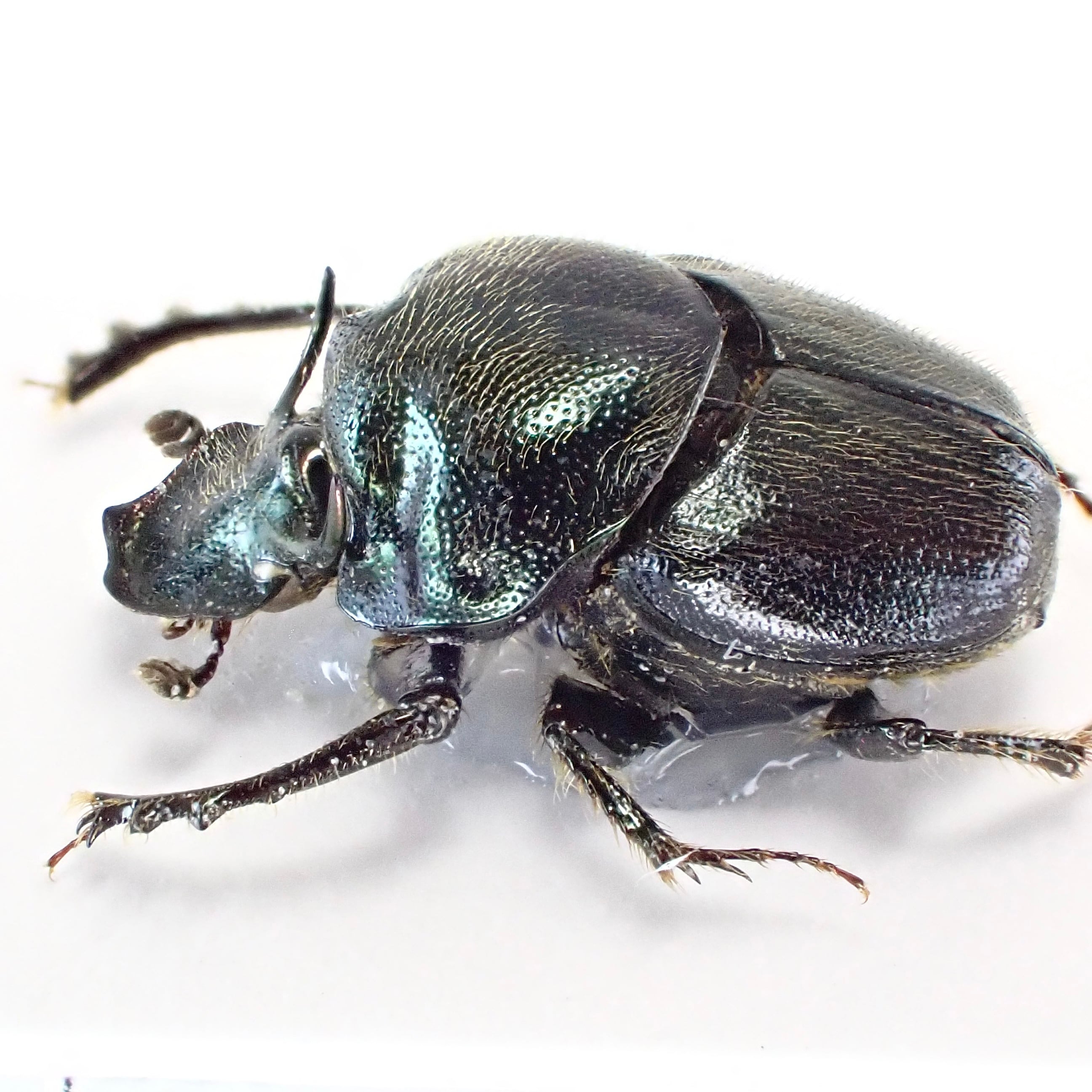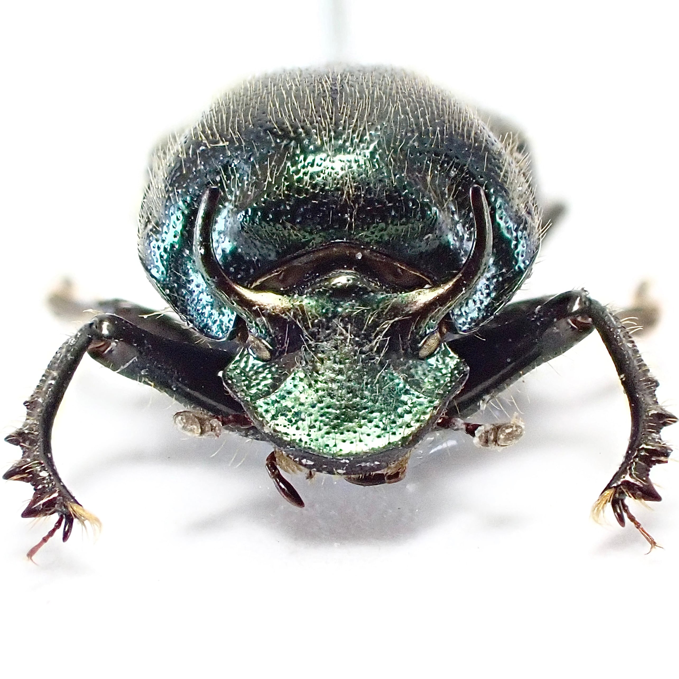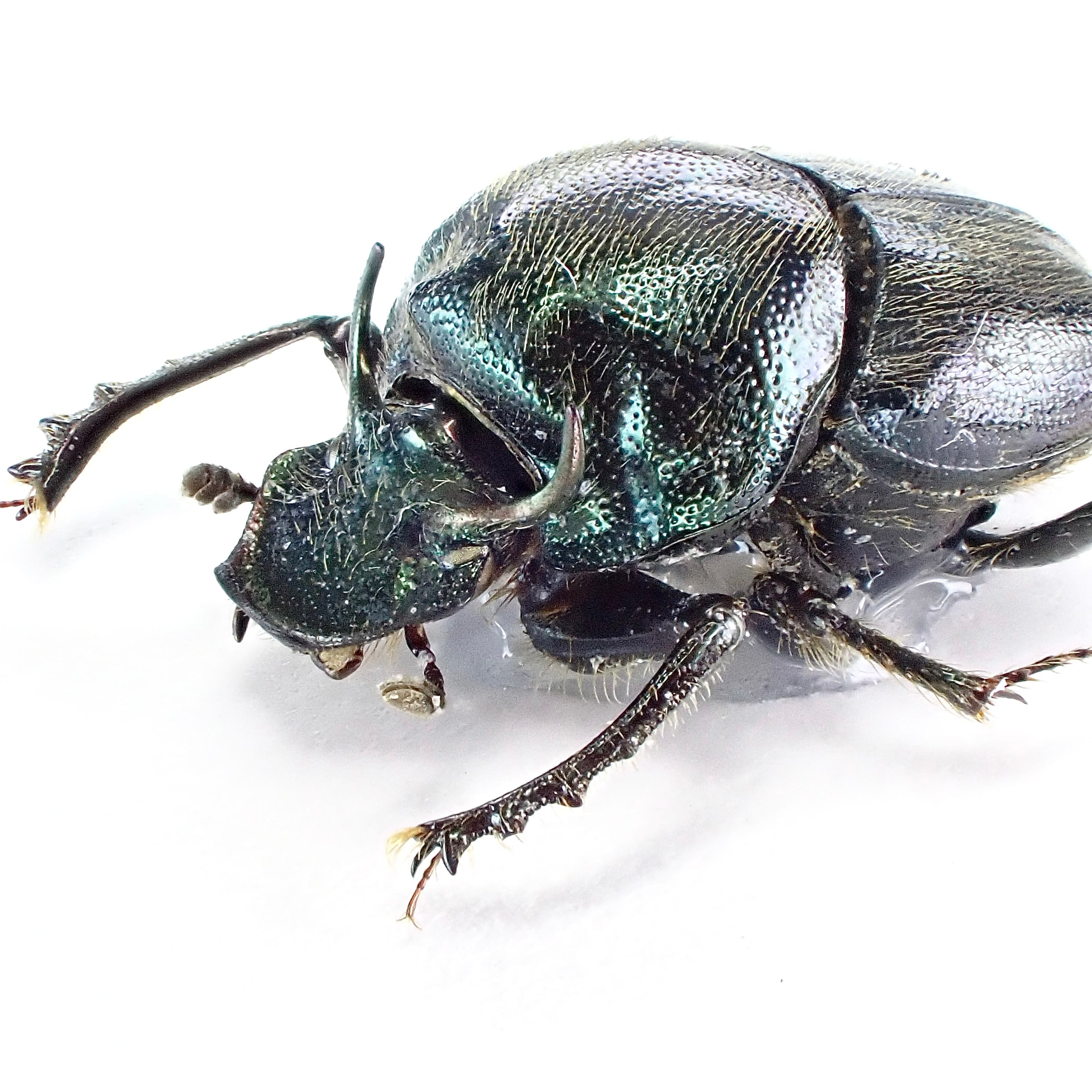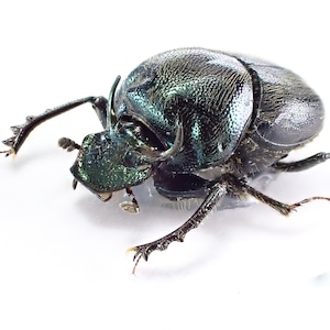 種名 : Onthophagus crinitus 産地 : パナマ 性別 : オス サイズ : 9mm 商品:♂1匹。写真の標本をお送りします。 解説:中南米産エンマコガネシリーズ。エメラルドブルーのボディに牡牛のようなツノ、長い前脚が特徴的。 状態:良好です ※細かい欠けやサイズのズレはご了承ください。