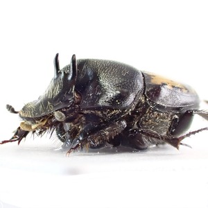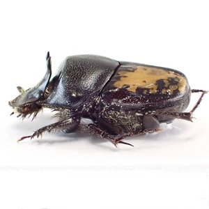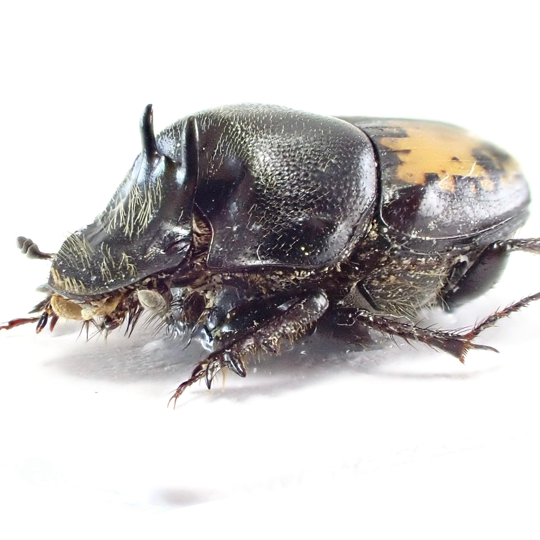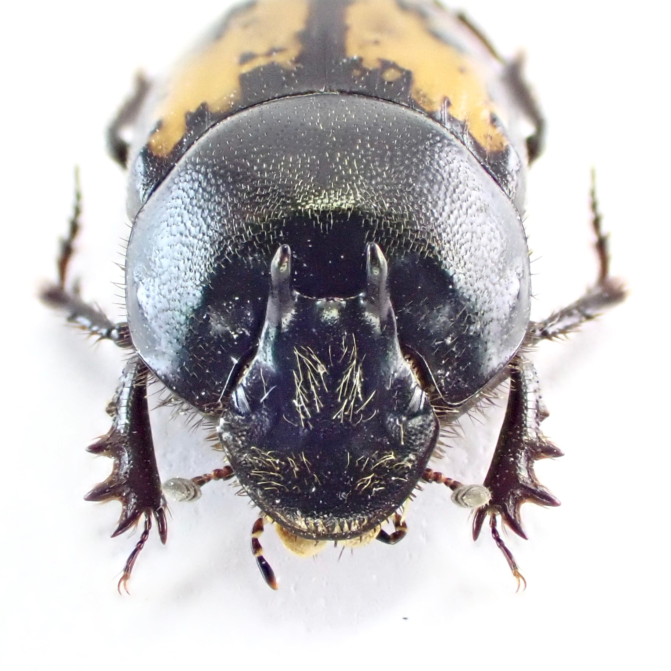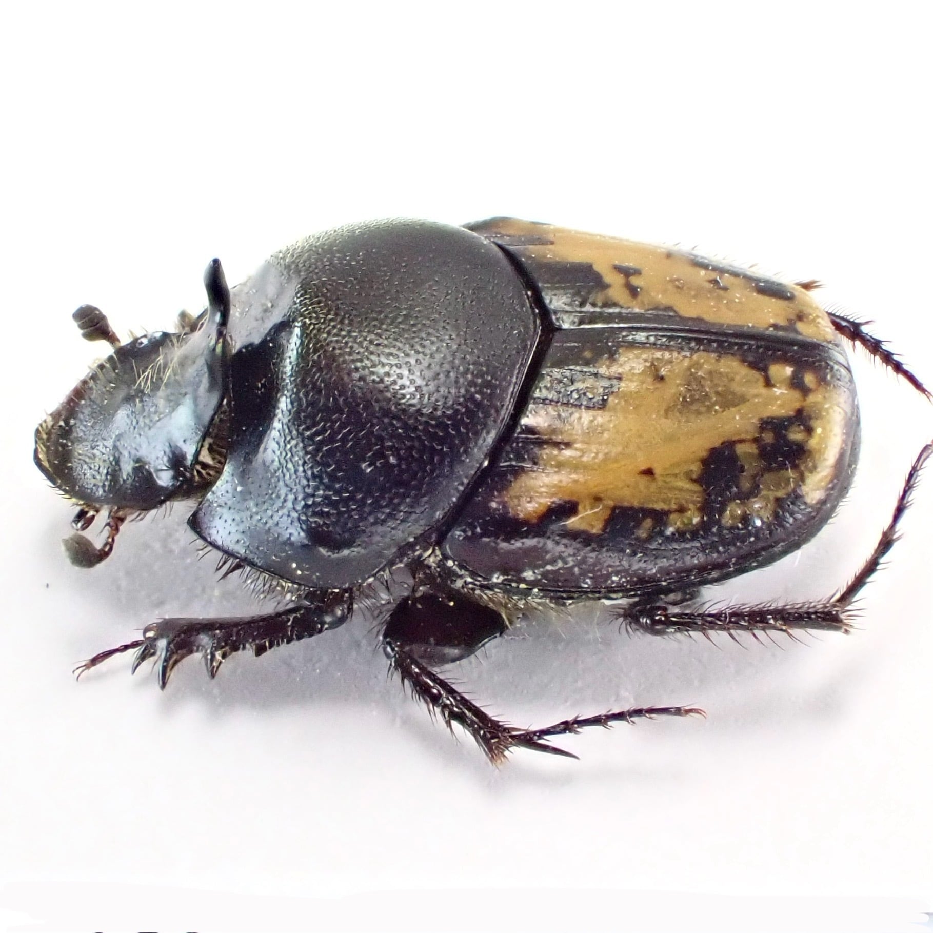 種名 : Onthophagus pygargus 産地 : ウズベキスタン 性別 : ペア サイズ : 10mm/9mm 商品:♂1匹♀1匹。写真の標本をお送りします。 解説:綺麗な黄色い上翅と迫り上がった先で2叉に分かれる頭角が特徴。 状態:良好です ※細かい欠けやサイズのズレはご了承ください。