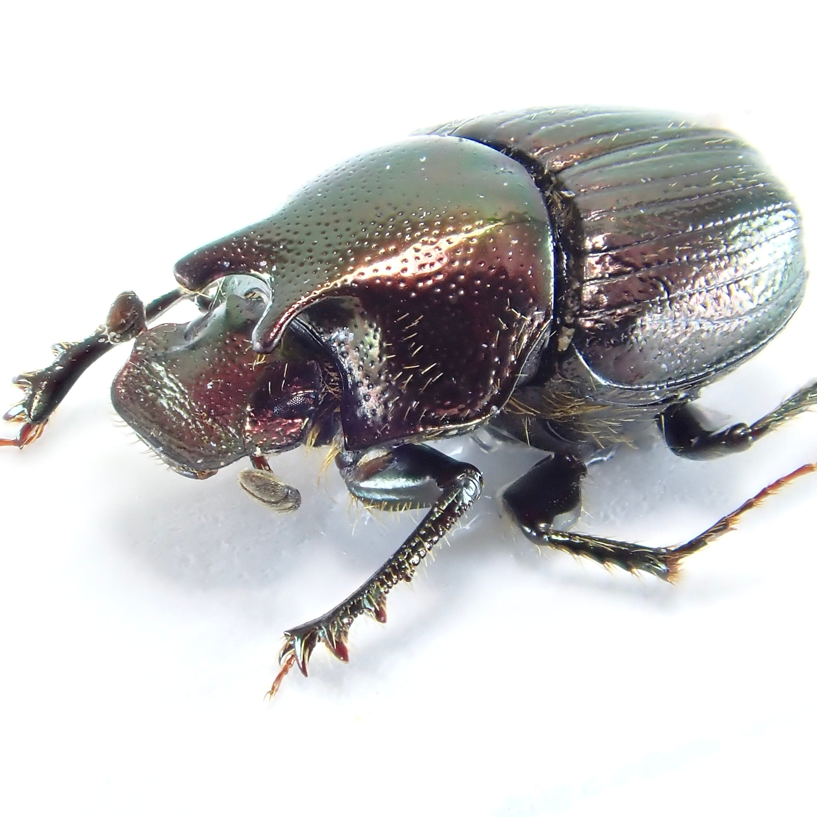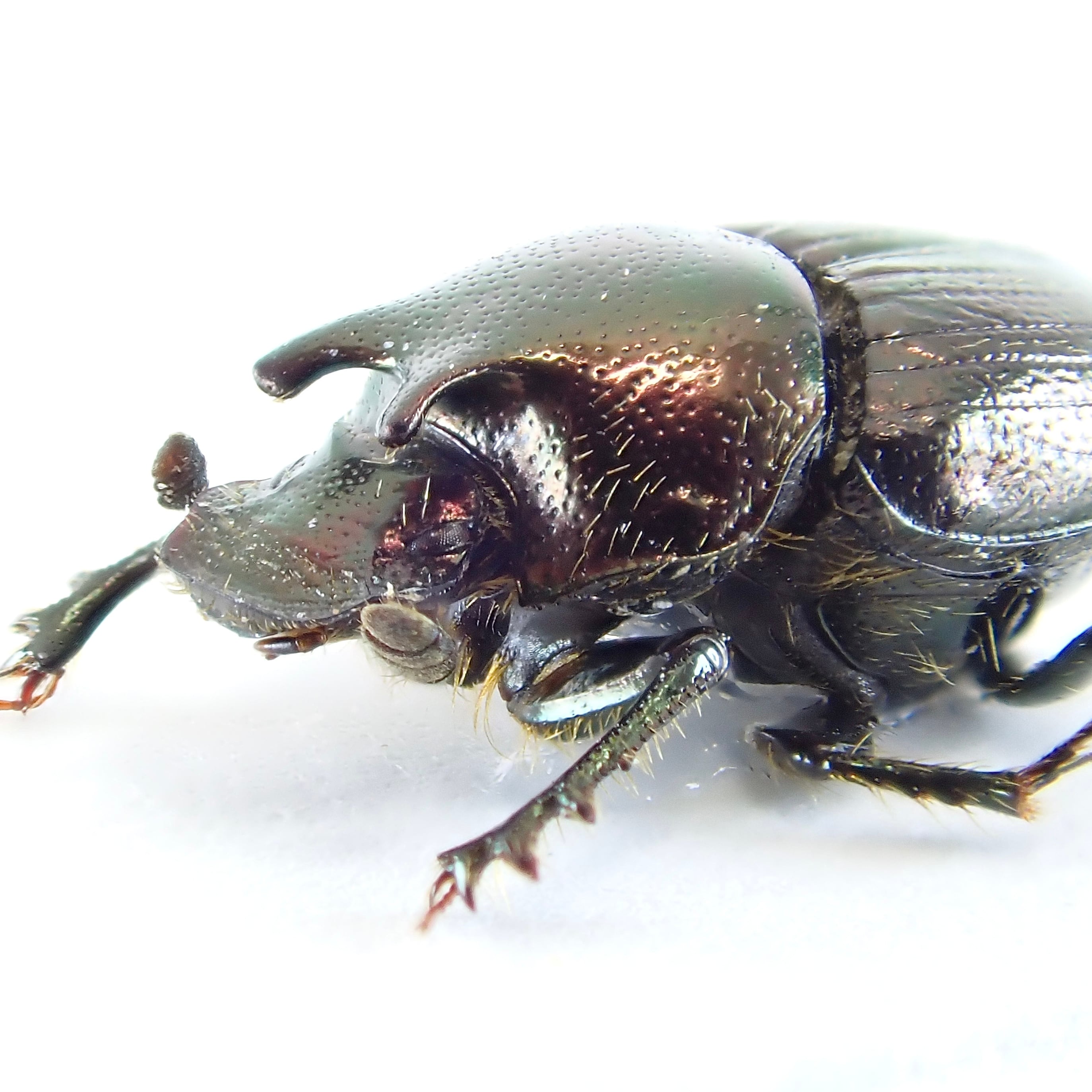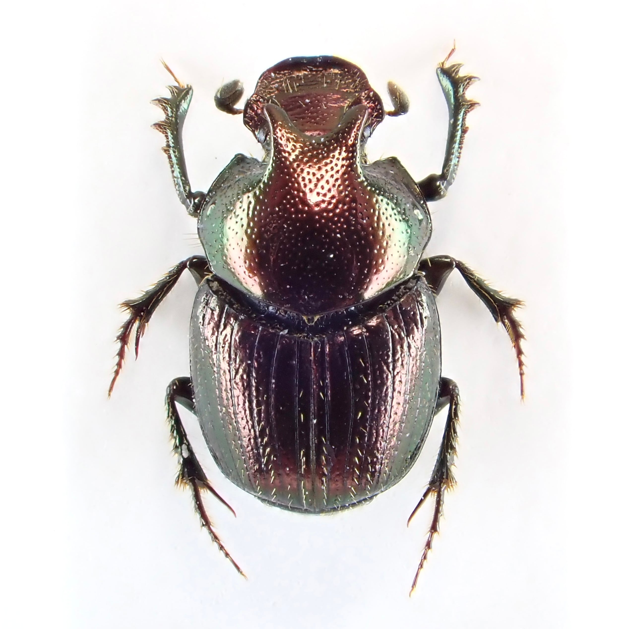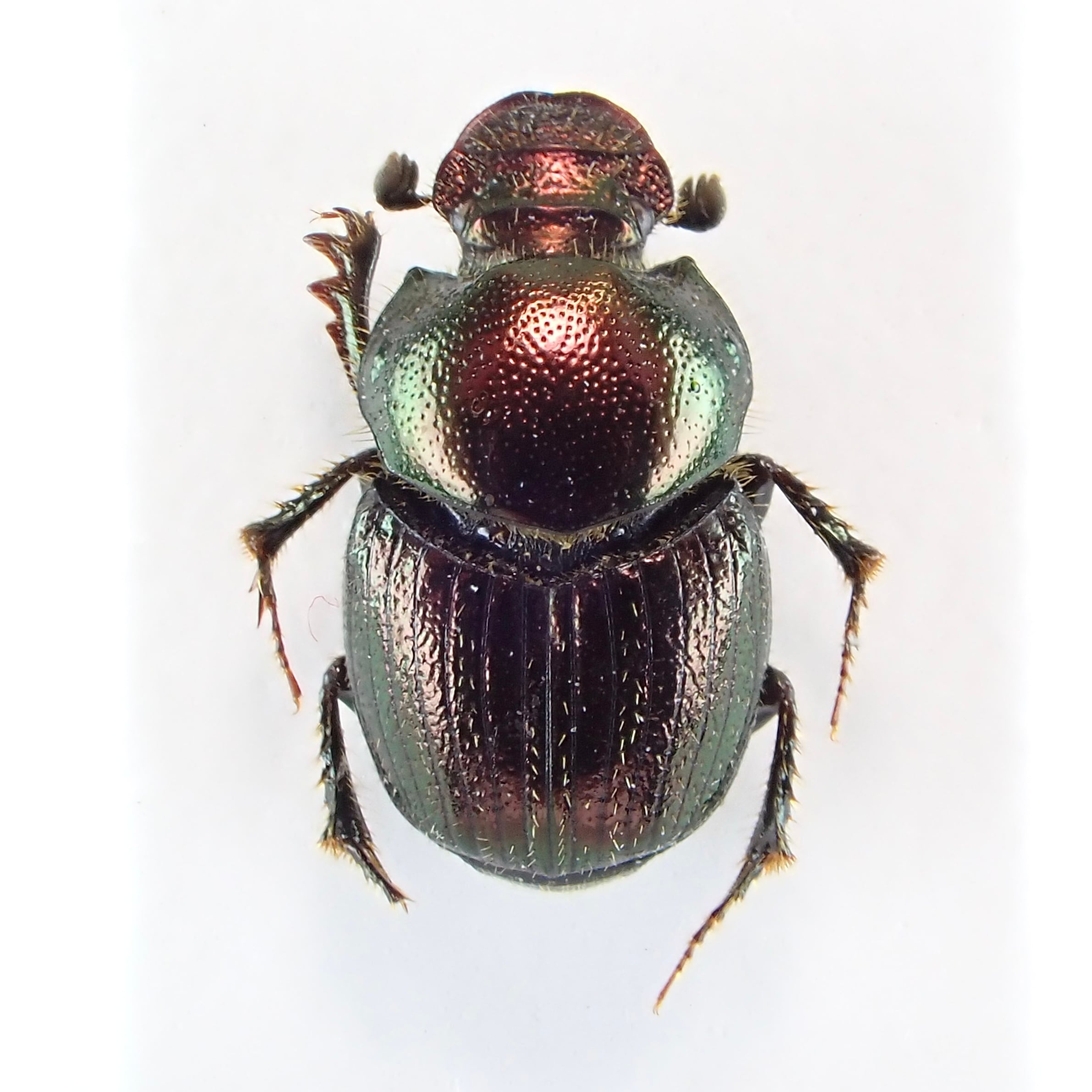 種名:Onthophagus orpheus 産地:アメリカ 性別:ペア サイズ:♂6mm,♀6mm 商品:♂1匹♀1匹。写真の標本をお送りします。 解説:迫り出した2本の胸角が特徴のエンマコガネ。小型種ながら赤銅色のボディで存在感十分。 状態:良好です ※細かい欠けやサイズのズレはご了承ください。