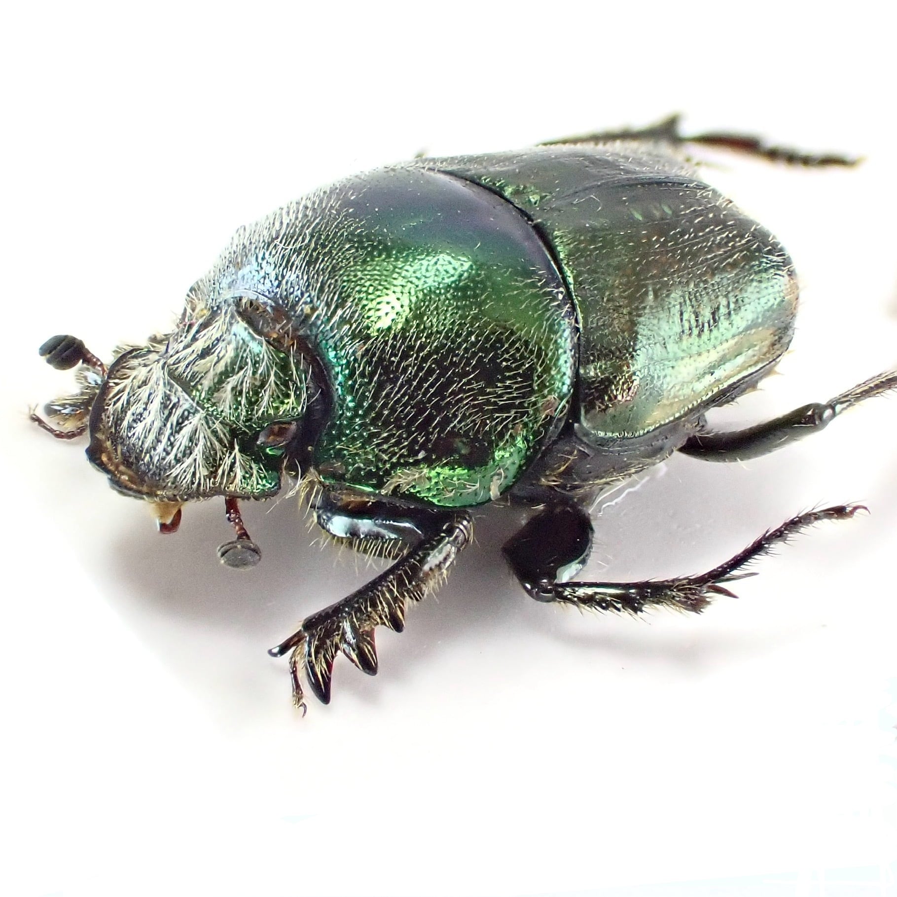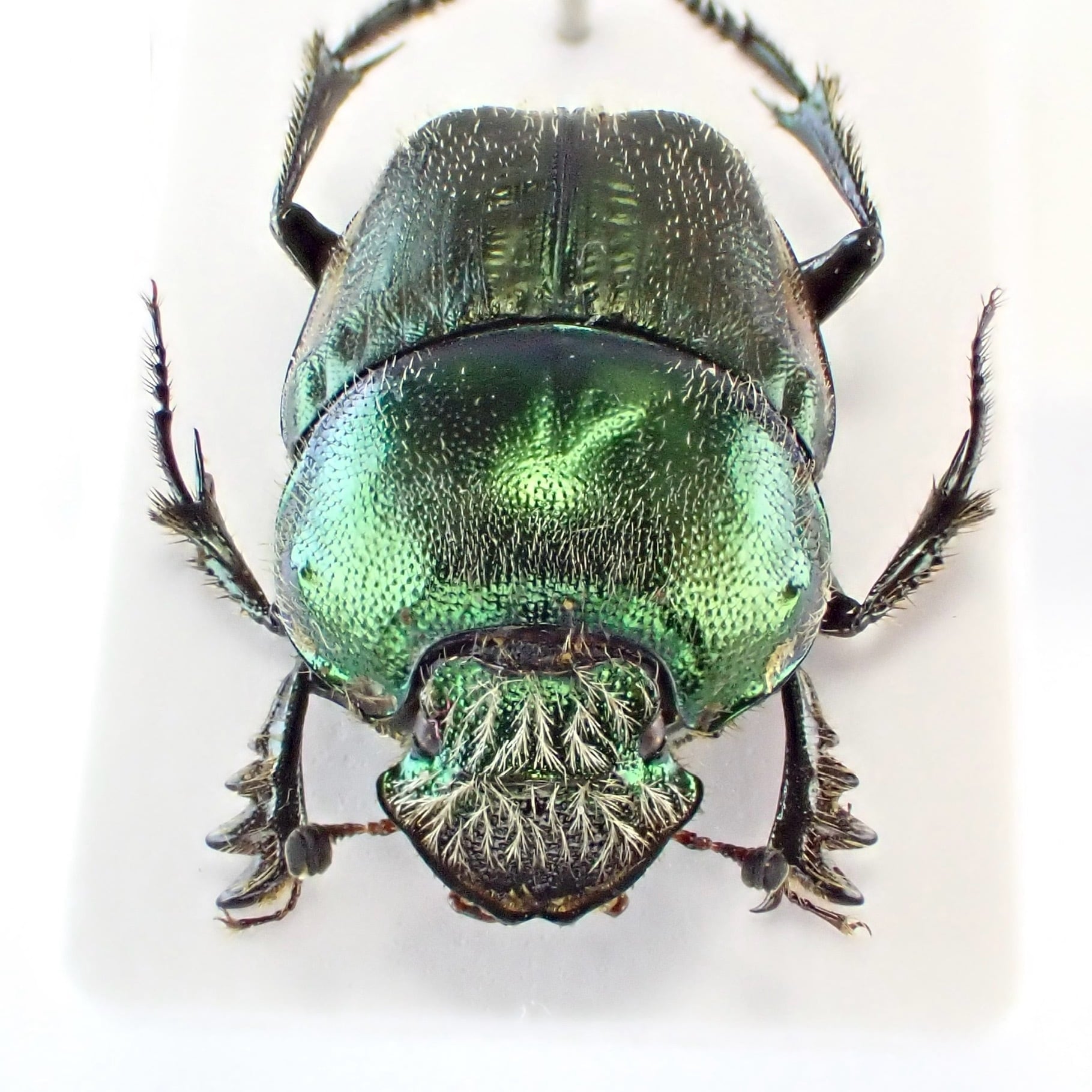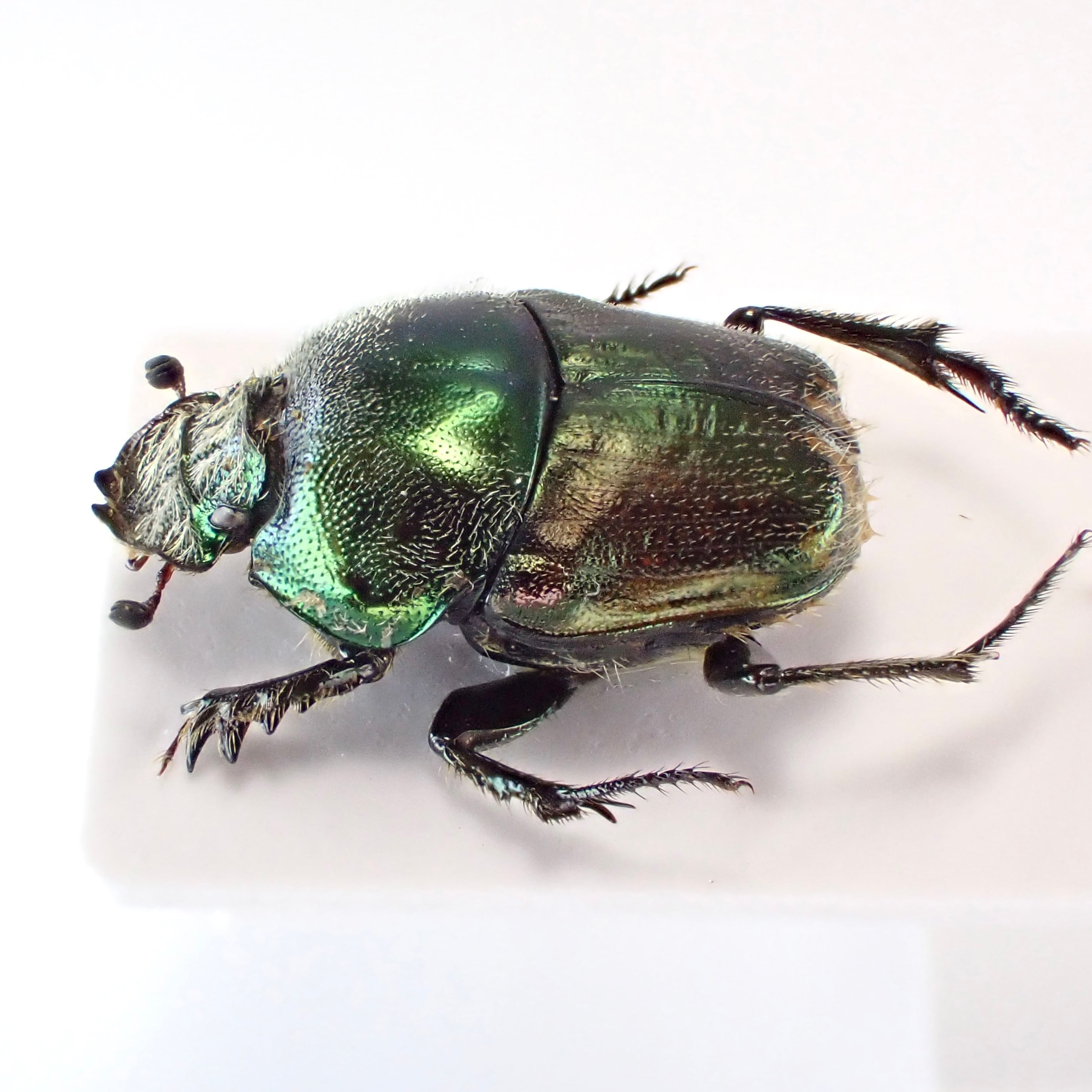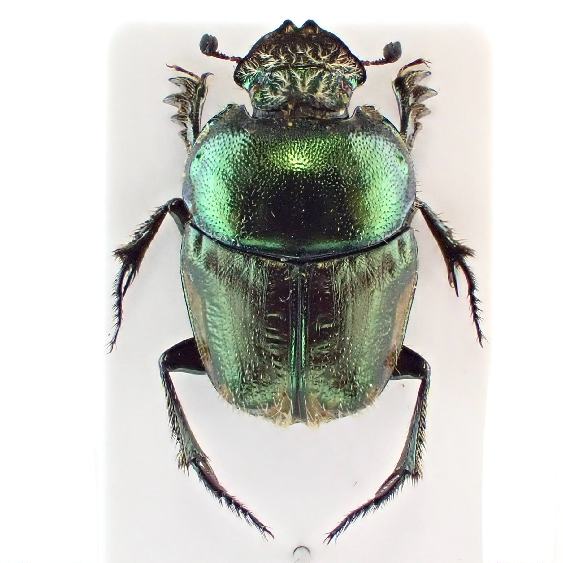 種名 : Phalops sp. 産地 : タンザニア 性別 : オス サイズ : ♂12mm 商品:♂1匹。写真の標本をお送りします。 解説:メタリックグリーンが美しい平たいエンマコガネ 。結構毛深い。 状態:良好です ※細かい欠けやサイズのズレはご了承ください。