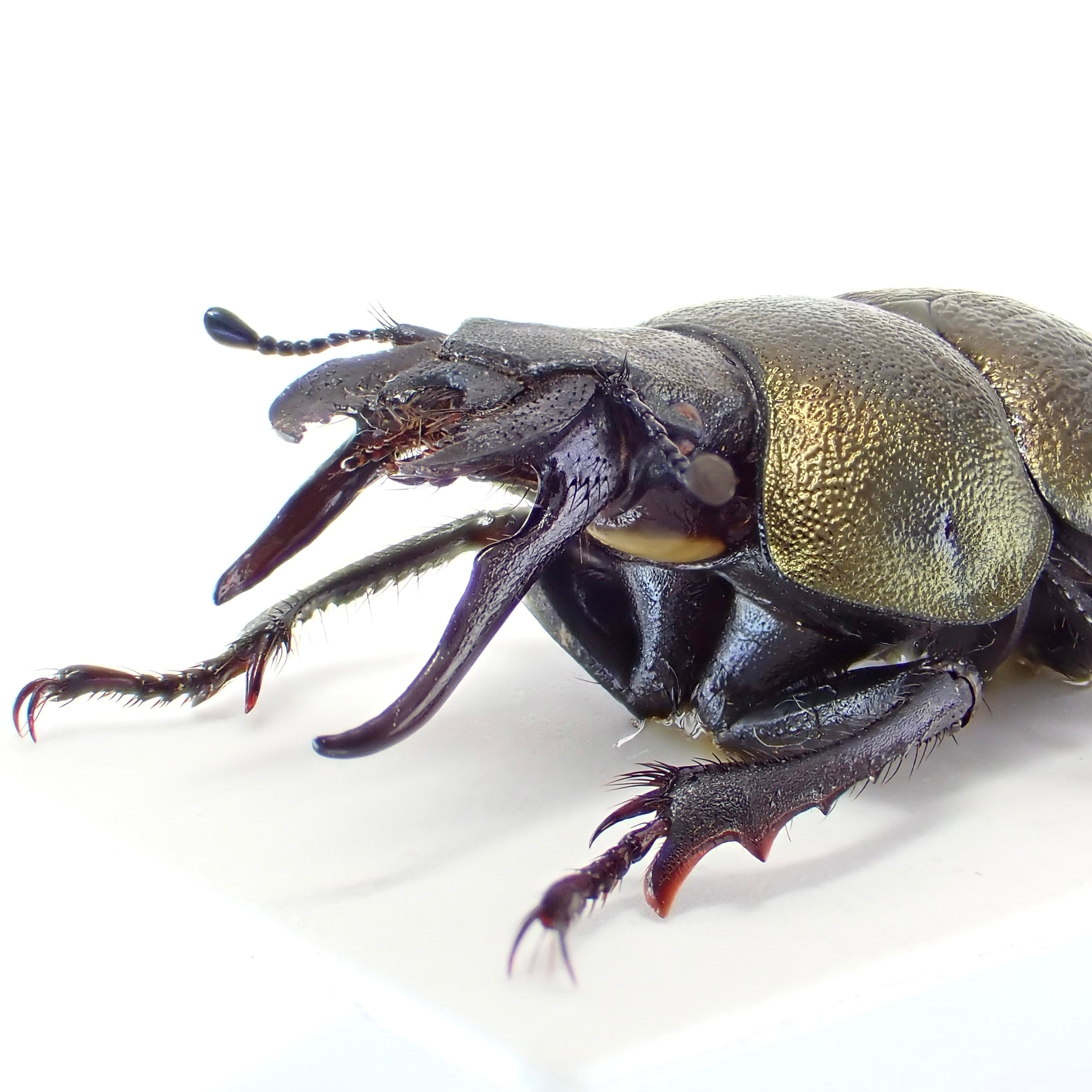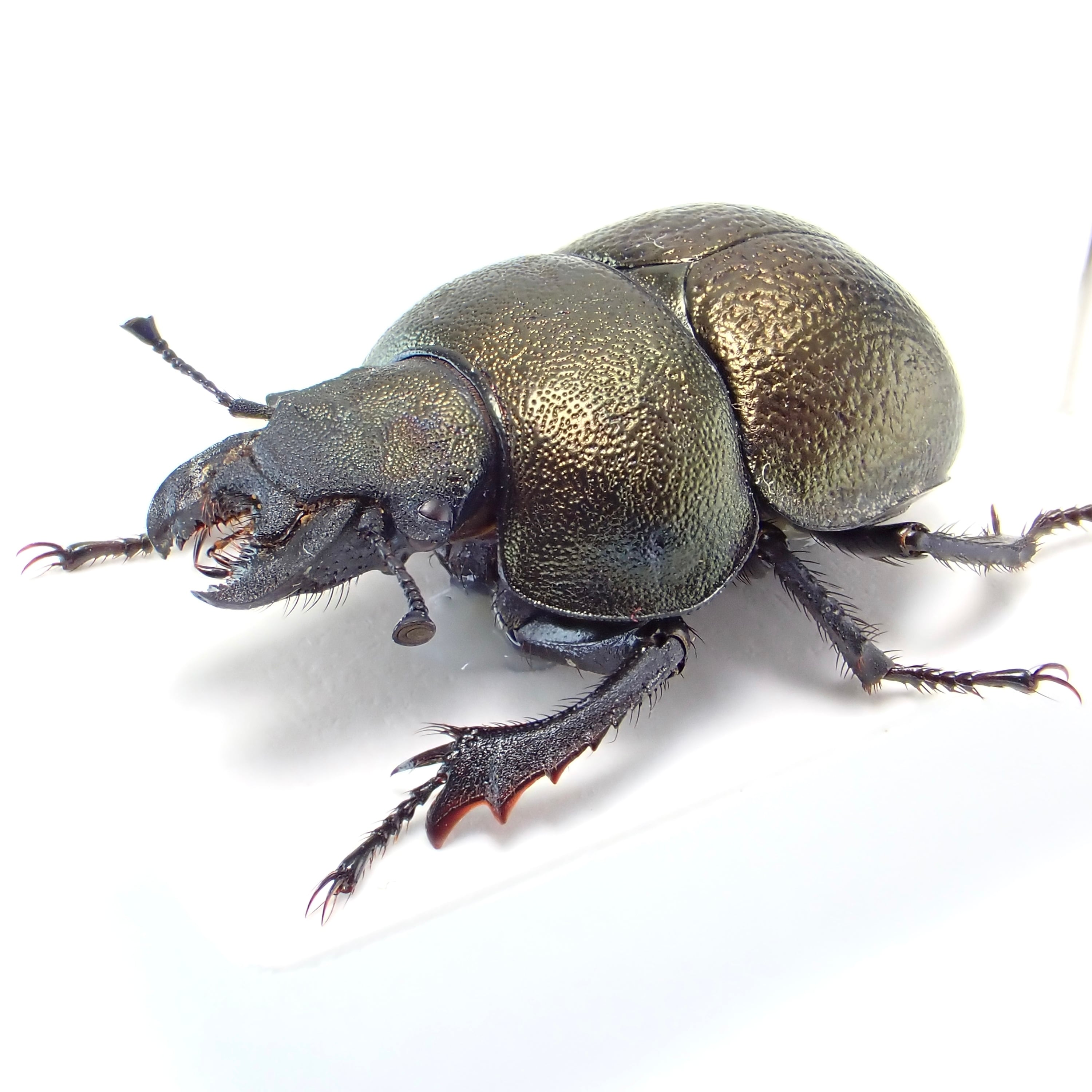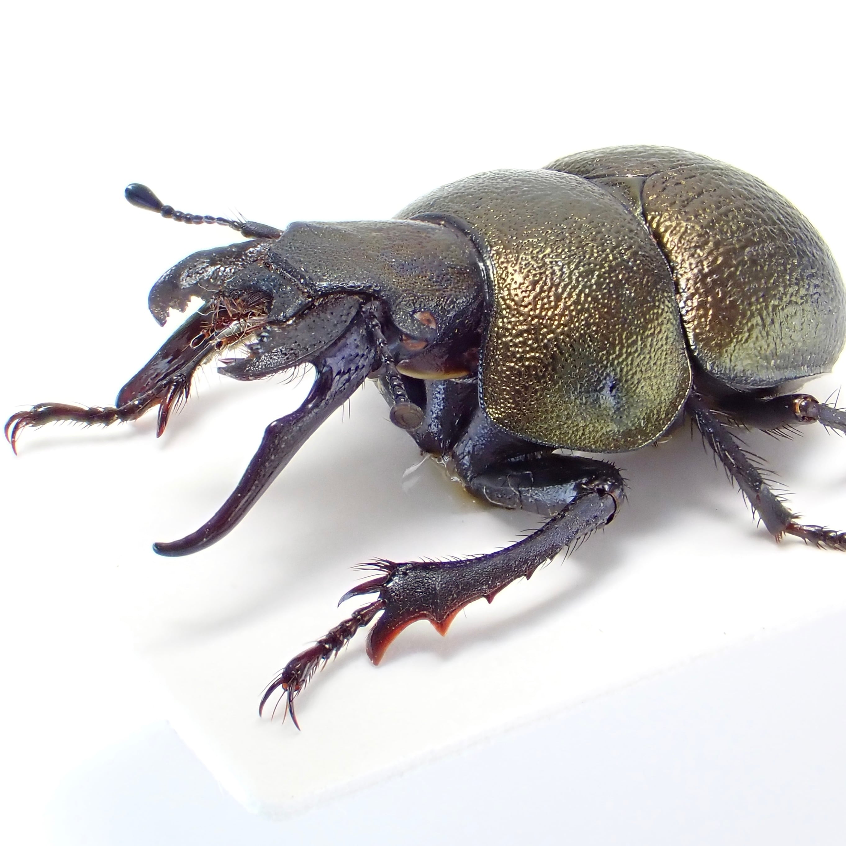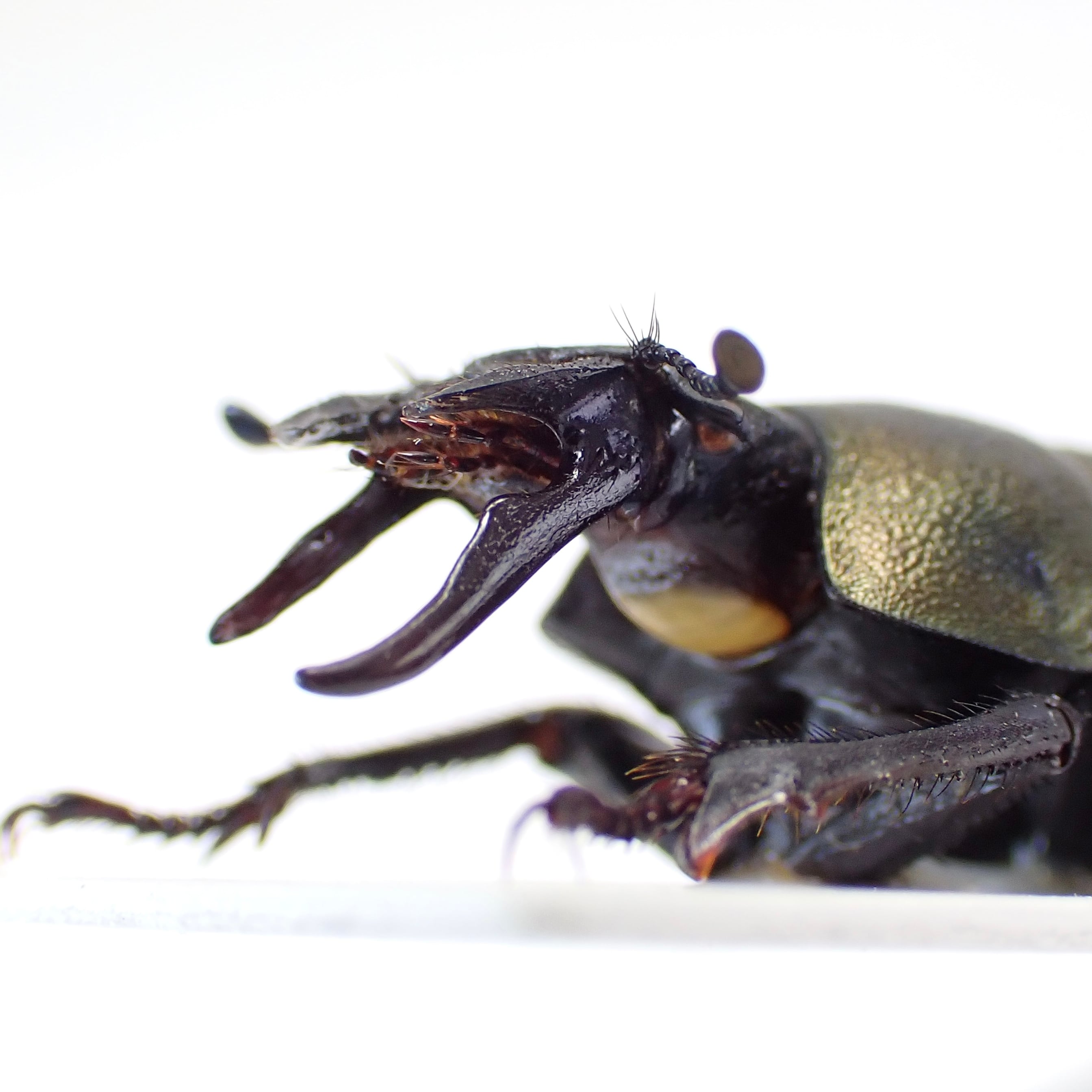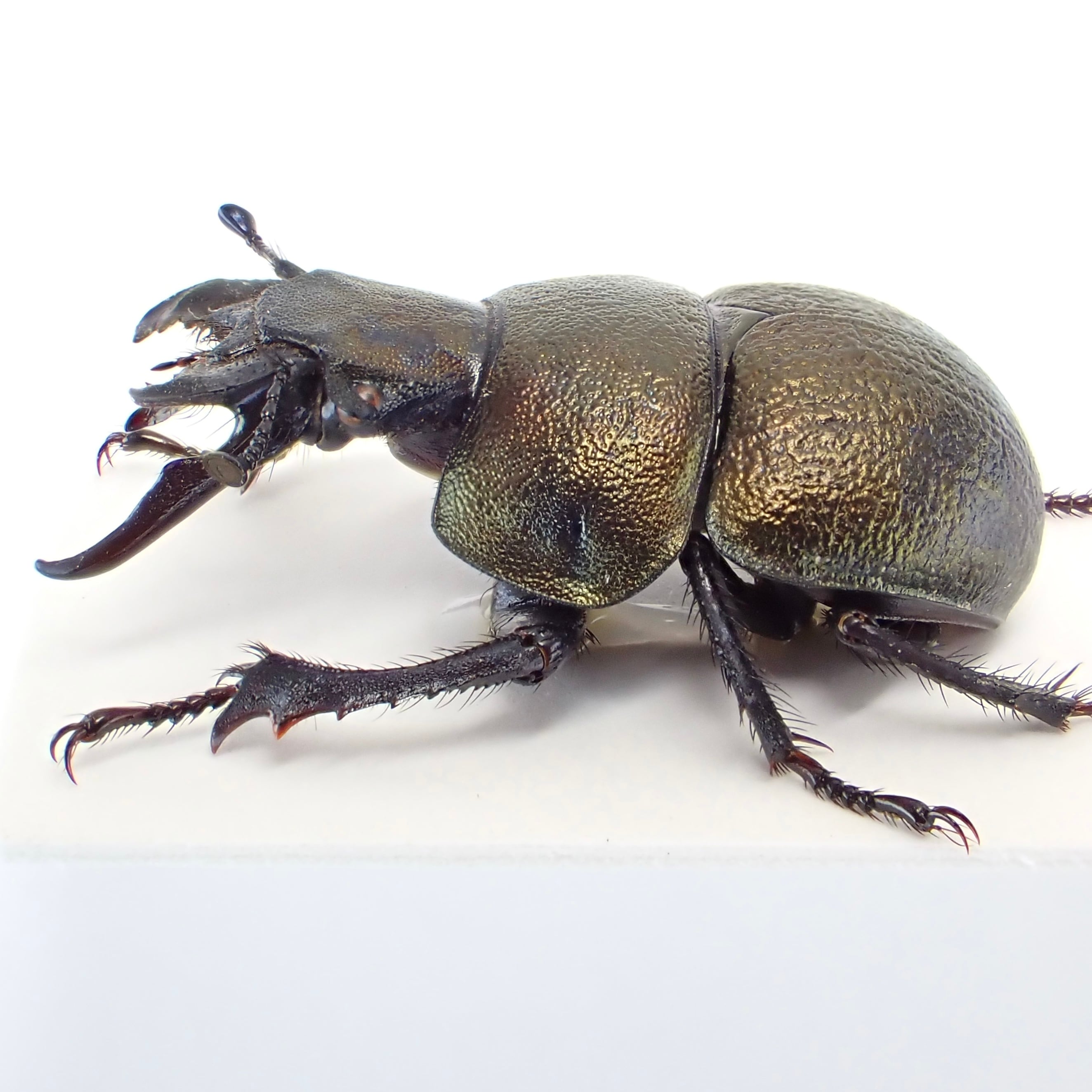 種名 : Lethrus appendiculatus 産地 : タジキスタン 性別 : ペア サイズ : ♂24(20)mm, ♀20mm ※括弧内は大顎を含まない大きさ 商品:♂1匹♀1匹。写真の標本をお送りします。 解説:鋭利で左右非対称の大顎と金色のボディが特徴的。 状態:良好です ※細かい欠けやサイズのズレはご了承ください。