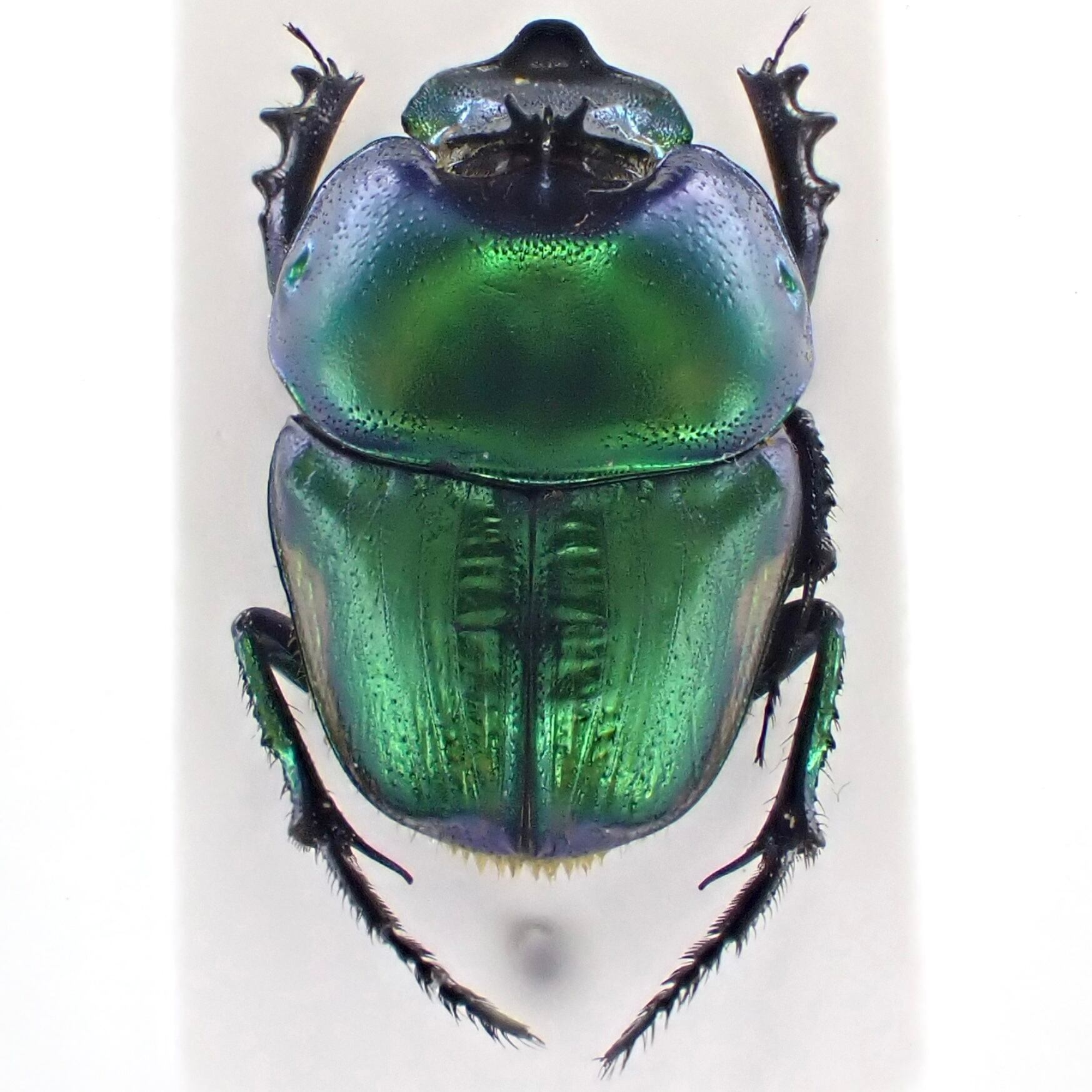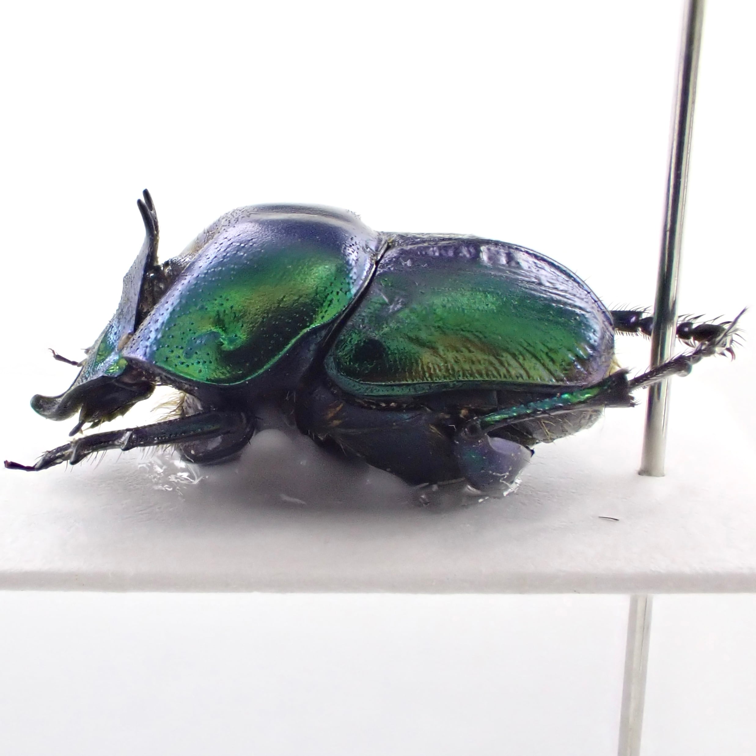 解説:メタリックグリーンのボディに頭部のフリルが特徴的なエンマコガネ 。